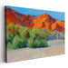 The primary colors of the artwork are the vivid reds and oranges of the mountains, harmoniously complemented by the greens of the bushes and the blues of the sky. This bold yet balanced color palette evokes a range of emotions, from warmth and awe to tranquility, enveloping the viewer in a sense of wonder and serenity.