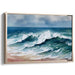 The sky above is a canvas of shifting grays and whites, hinting at a cloudy yet hopeful day with subtle rays of sunlight piercing through. The meticulously detailed waves exhibit frothy white crests and a spectrum of blues and greens, conveying the ocean's depth and vitality. In the foreground, the sandy shore is painted in soft, earthy tones, creating a serene juxtaposition against the vibrant ocean hues.