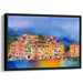 Introducing 'Seaside Watercolor Village: Coastal Village in Watercolor,' a mesmerizing canvas art that transports you to a charming coastal Mediterranean village reminiscent of the Italian Riviera. This artwork captures the essence of clustered, colorful buildings emerging from the water's edge, painted in a delightful palette of warm hues including shades of orange, pink, and yellow against the deep blue and indigo tones of the water and sky.