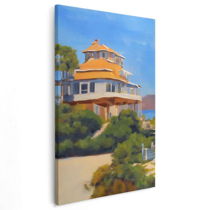 Introducing "Serenity Echoes Through Verdant Abode: Tranquil House Amidst Lush Greenery," a mesmerizing landscape canvas art that transports you to a serene coastal oasis, where a unique, multi-tiered house stands gracefully amidst verdant foliage. This captivating artwork captures the essence of tranquility and sophistication, inviting you to immerse yourself in a scene of natural beauty and architectural elegance.