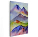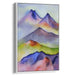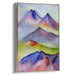 The primary tones of soft blues and purples gracefully dominate the mountain ranges, while secondary shades of green, orange, and yellow meld seamlessly into the foreground, imparting a profound sense of depth and tranquility to the scene. The artist's fluid and dreamlike brushwork enhances the gentle gradients and soft edges of the hills, evoking a mood of peace and contemplation.