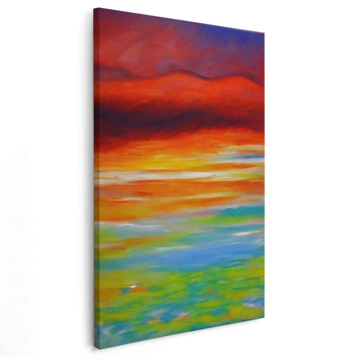 Step into the mesmerizing world of 'Spectral Horizon: A Vivid Landscape of Color,' a captivating canvas art piece that transports viewers to a realm of transformative beauty and vibrant hues. This artwork depicts an otherworldly landscape where the fiery tones of a setting sun seamlessly merge with a lush, green foreground, culminating in a serene expanse of blue.