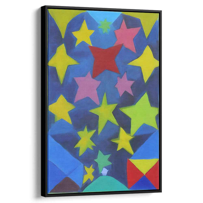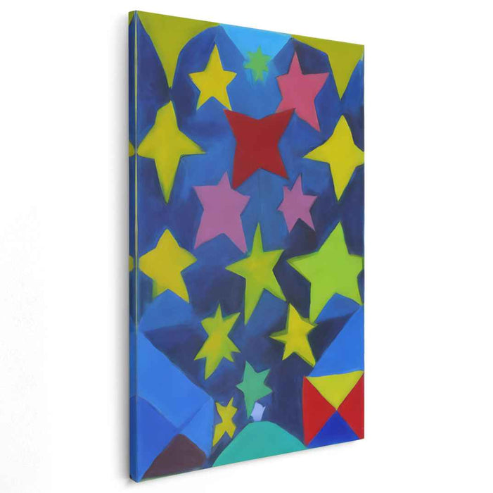 Introducing 'Stellar Arrangement,' a captivating canvas art print that bursts with a symphony of bold geometric stars against a rich, deep blue backdrop, creating a dynamic and vibrant visual experience. This artwork is a celebration of color and shape, with stars of various sizes and hues dancing across the canvas in a joyful and playful display.