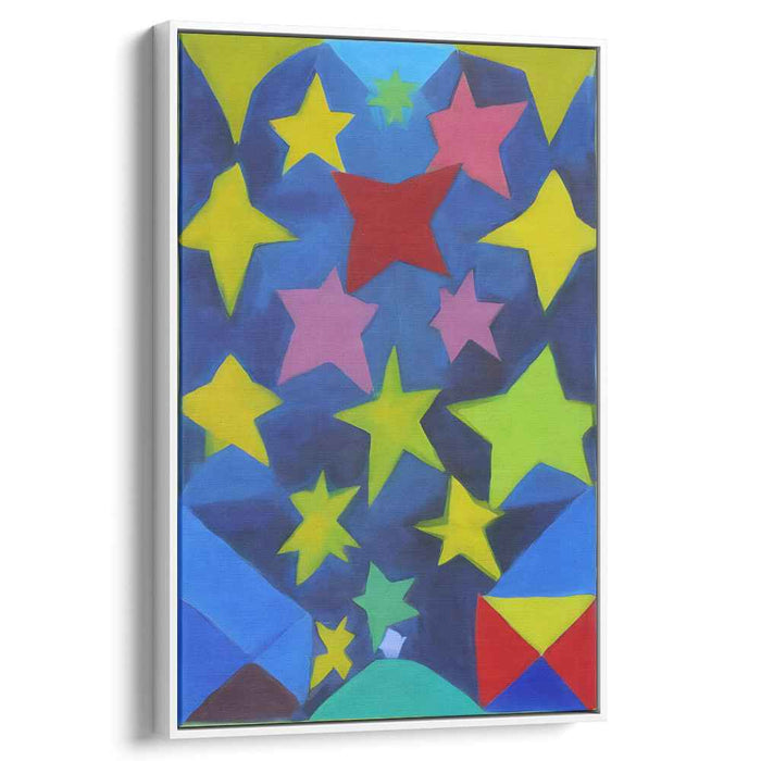The stars in 'Stellar Arrangement' shine in vivid primary and secondary colors like bright yellow, red, pink, green, and blue, exuding a sense of wonder and excitement. The contrast between the intense hues of the stars and the deep blue background adds depth and drama to the composition, inviting viewers into a whimsical universe of geometric forms and lively colors.