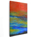 The top portion of the canvas is a spectacle of warm reds transitioning into a gradient of oranges, reminiscent of a breathtaking sunset or sunrise. The bold and vibrant colors create a striking contrast against the cool tones of the water, ranging from deep blues to tranquil greens and yellows, evoking a sense of peaceful coexistence.