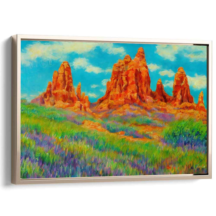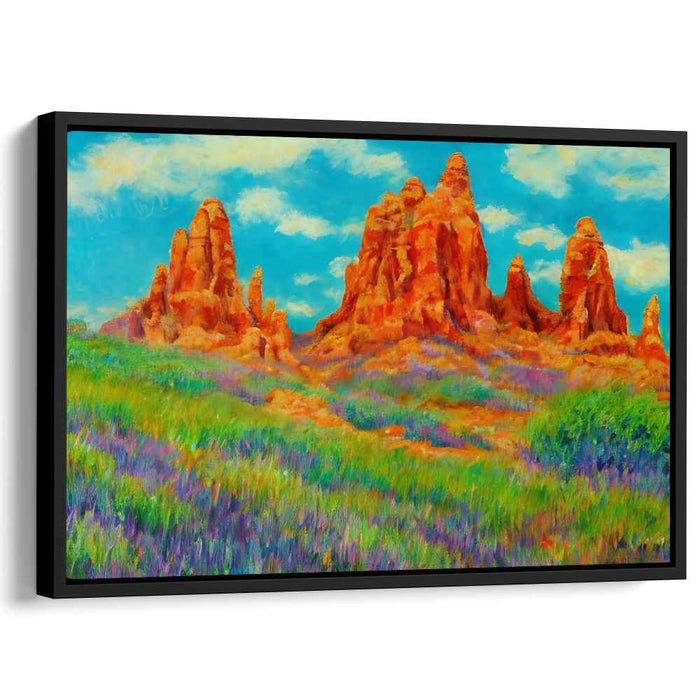 The artwork features towering, jagged red rocks rising from a lush field of wildflowers in vibrant orange-red hues, beautifully contrasted by the deep blues and turquoises of the sky. The secondary colors of green, purple, and yellow in the wildflowers create a harmonious and lively palette that adds depth and richness to the composition.