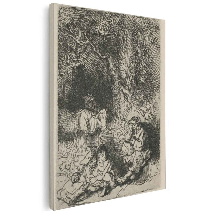 Immerse yourself in the serene beauty of Rembrandt's "The Shepherds and the Family," painted in 1644. This enchanting canvas, now available as a high-quality print, invites you to experience the warmth and intimacy of a pastoral scene.