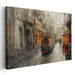 Introducing 'Timeless Tramway: A Nostalgic Journey through Historic Streets,' a captivating canvas art that immerses viewers in a bustling, old-world cityscape teeming with life and rich ambiance. This masterpiece portrays a vintage tram gracefully gliding down a narrow street adorned with charming shops and luminous streetlights, evoking a profound sense of nostalgia and enduring allure. The artwork is bathed in a soft, moody light that accentuates the textures of the glistening cobblestone road and the weathered facades of the buildings.