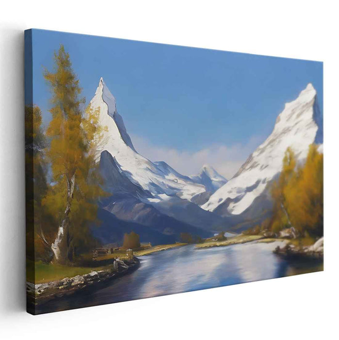 Introducing 'Tranquil Peaks Vista: Serene Mountain Landscape Canvas Art Print,' a captivating masterpiece that transports you into the heart of a majestic mountainous realm, where nature's grandeur unfolds in all its splendor. This breathtaking landscape painting showcases two towering snow-capped peaks that command the background, mirrored in the tranquil, crystal-clear river meandering gently through the scene.