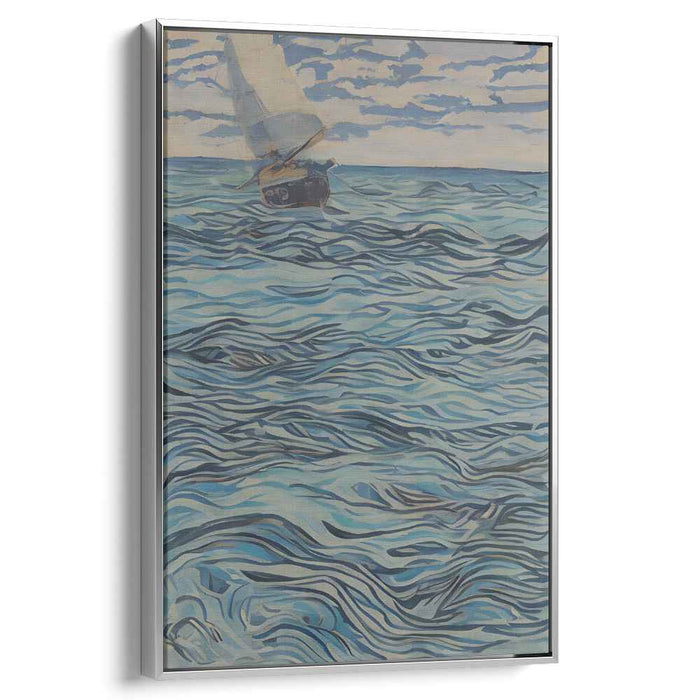 The artist skillfully employs a palette dominated by various shades of blue, interspersed with highlights of white and hints of darker hues, to portray the tranquil expanse of the sea. The fluid, almost hypnotic lines depicting the waves create a mesmerizing pattern that mirrors the natural ebb and flow of water. The sailboat, with its billowing sails catching the wind, serves as a focal point, infusing the scene with a sense of both tranquility and exploration.