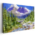The foreground features a crystal-clear stream meandering through a lush forest of evergreen trees, their vibrant green foliage contrasting beautifully with the rugged, rocky terrain. The interplay of light and shadow across the mountains and trees adds depth and realism to the painting, drawing the viewer into a world of serene wilderness.