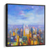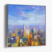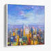 Introducing 'Urban Mirage at Dawn: Sunrise Over Urban Horizon,' a dynamic canvas art print that captures the vibrant energy of an urban landscape awakening to the first light of dawn. This striking artwork bursts with a kaleidoscope of colors, predominantly vibrant yellows and oranges, reminiscent of the sun's early morning glow enveloping the cityscape.