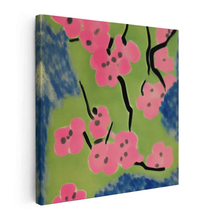 Introducing "Urban Sakura Bloom," a mesmerizing canvas art print that captures the essence of spring's renewal through a vibrant depiction of cherry blossoms set against a lush green backdrop and a serene sky-blue ambiance. This artwork portrays cherry blossoms in a stunning pink hue, exuding a delicate and almost otherworldly quality, their petals seemingly ephemeral and fragile. The bold black strokes of the branches provide a striking contrast to the vivid blossoms and the tranquil background, creating a visually captivating scene.