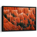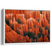 The canvas comes alive with a rich symphony of crimson and orange hues, infusing the scene with a warmth that radiates vibrant energy. The intricate textures of the rock formations are meticulously portrayed, standing in stark contrast to the soft, organic shapes of the green coniferous trees that grace their bases. Light and shadow play harmoniously, accentuating the canyons' depth and creating a sense of three-dimensional immersion.