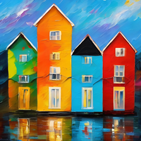 This artwork pays homage to Fauvist masters like Henri Matisse and André Derain through its expressive use of color and technique. The whimsical and fantastical portrayal of the houses, coupled with the reflection in the water below, adds a touch of realism to this vibrant composition.