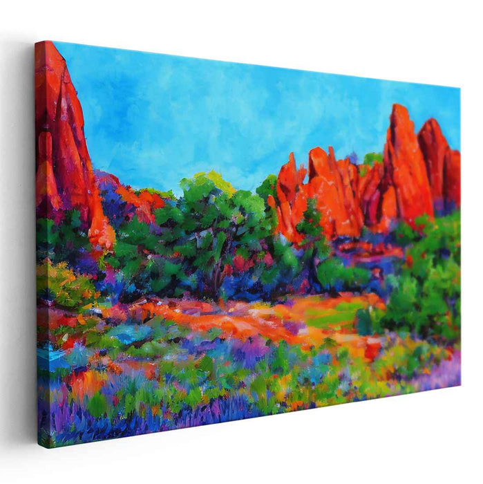 The canvas bursts with bold reds and oranges of the majestic rocks, harmoniously offset by the cool blues and greens of the vegetation. The artist's use of color, reminiscent of Fauvism, infuses the scene with vitality and energy, while the loose, Impressionistic brushstrokes add a sense of movement and light play.