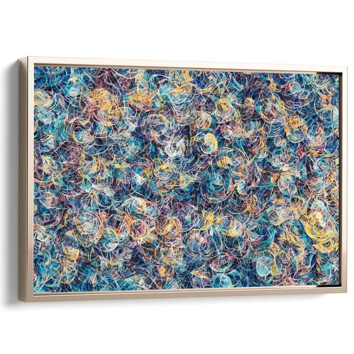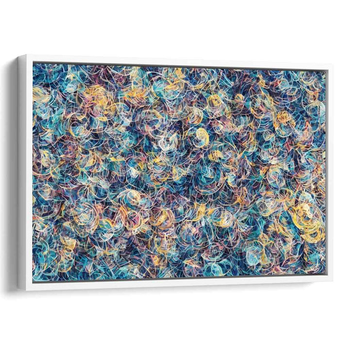 Introducing "Whirling Hues," an abstract expressionist canvas art print that mesmerizes with its swirling patterns and vibrant colors, offering an immersive visual journey into a tapestry of interlocking circles and loops. The primary color palette, dominated by shades of blue from deep navy to soft sky blue, is complemented by hints of gentle yellows, pinks, and whites, creating a dynamic and intricate composition.