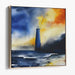 The sky in 'Whispers Amid Ocean Storms' is a spectacle of vivid blues, oranges, and yellows, hinting at a tempestuous sunset. Contrasting this, the deep, serene blue of the ocean provides a sense of grounding amidst the stormy atmosphere. The lighthouse, painted in a dignified navy blue, stands out as a symbol of strength and guidance, offering a focal point of resolute steadiness.