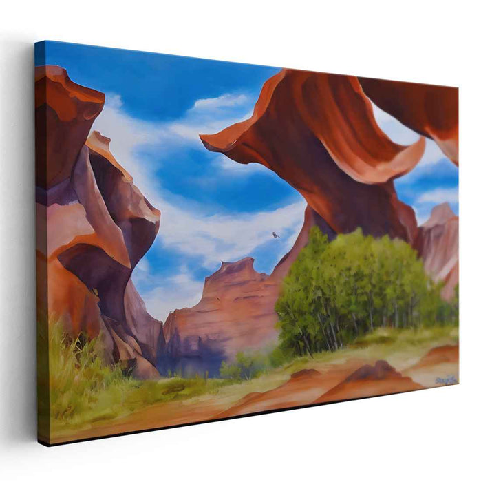 Introducing 'Whispers Among Stone Shadows: Serene Canyon Landscape,' a captivating canvas art print that transports viewers to a breathtaking desert oasis, where majestic rock formations and lush greenery converge in a harmonious display of nature's grandeur. This stunning artwork captures a serene desert landscape under a vibrant blue sky, juxtaposed against the warm, earthy tones of red and brown sandstone arches, creating a visually striking and emotionally evocative scene.