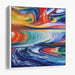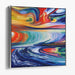 The piece is a symphony of bold and intense colors, predominantly rich blues that convey the depth and power of the sea. These blues dance harmoniously with fiery reds, warm oranges, and bright yellows, creating a captivating contrast reminiscent of a breathtaking sunset or sunrise reflecting on the water's surface.