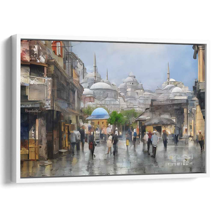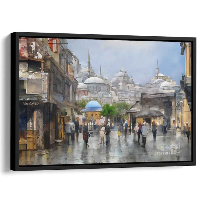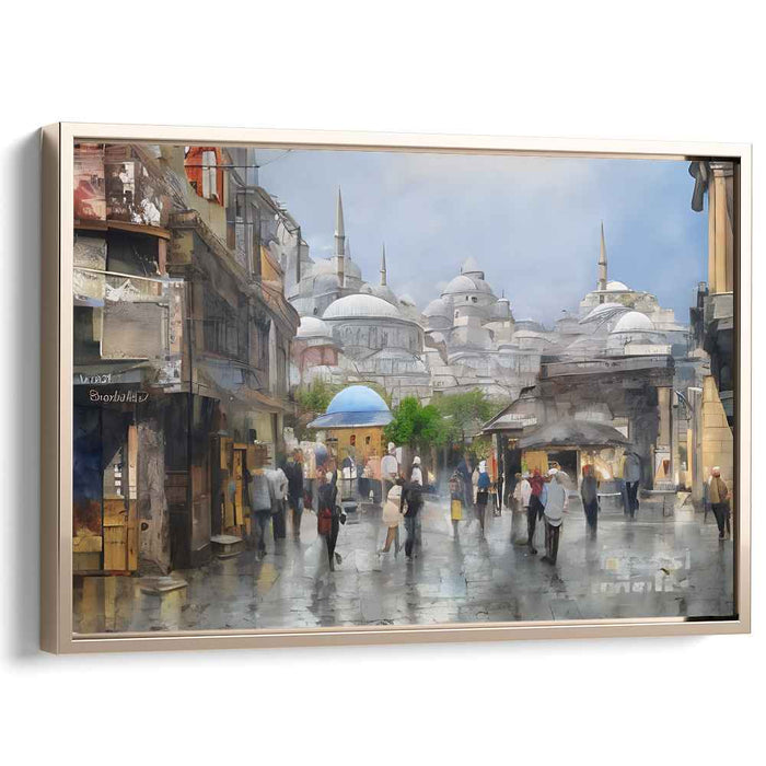Immerse yourself in the vibrant energy of the "Whispers of Wet Commerce: Bustling Marketplace in Rain," a mesmerizing landscape canvas art that captures a bustling street scene against the backdrop of an iconic cityscape, reminiscent of historic Istanbul. This captivating artwork seamlessly blends contemporary urban life with timeless architectural marvels, portraying a lively marketplace where people go about their daily routines amidst grand structures.