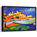 Introducing 'Wild Brushstrokes Adventure: Vibrant Fauvist Landscape,' a mesmerizing canvas art print that captures the essence of a lively Mediterranean village drenched in sunlight, overlooking a peaceful body of water. This artwork is a symphony of primary colors, with striking splashes of yellow, orange, and red dominating the scene, harmoniously contrasted by deep blues and greens, creating a visual feast for the eyes.