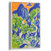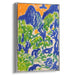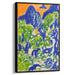 The composition of this piece is dominated by the majestic blue mountains, depicted with confident and broad strokes that exude strength and grandeur. At the foot of these towering peaks, lush green foliage and trees come to life with dynamic and swirling brushstrokes, imbuing the scene with a sense of movement and vigor.