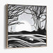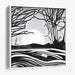 The artwork portrays a serene scene with flowing, rhythmic lines defining a gentle, undulating terrain that leads to a tranquil body of water reflecting the moon's brilliance. The bold use of stark black and white intensifies the interplay of light and shadow, infusing the piece with a graphic quality that feels both contemporary and timeless. Black takes center stage, while white serves as a powerful secondary color, establishing a visually arresting polarity.