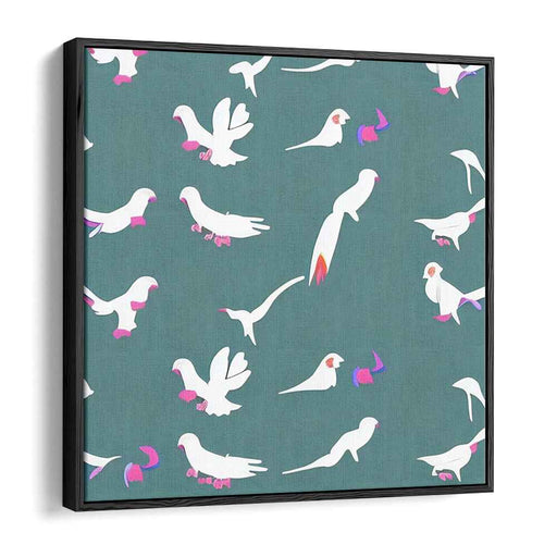 Splashy Feathers Dance High: Vibrant Birds on Bold Blue Canvas Art Print