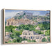 The painting showcases a rich palette dominated by earthy tones of beige and brown, highlighting the stately stone buildings against the backdrop of lush greens of the surrounding foliage. The sky, rendered in soft blues and whites, evokes a sense of peace and clarity, suggesting a serene day in ancient Athens.