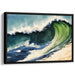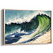 The artist's meticulous attention to detail shines through in the depiction of the wave's crest, where foamy, frothy white water cascades over deep, rich greens and blues, creating a vivid contrast that mesmerizes the viewer. The primary colors of deep ocean blues and vibrant greens harmonize seamlessly with secondary tones of sandy beige and crisp white, immersing the observer in the ocean's vivid palette.