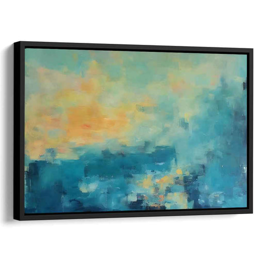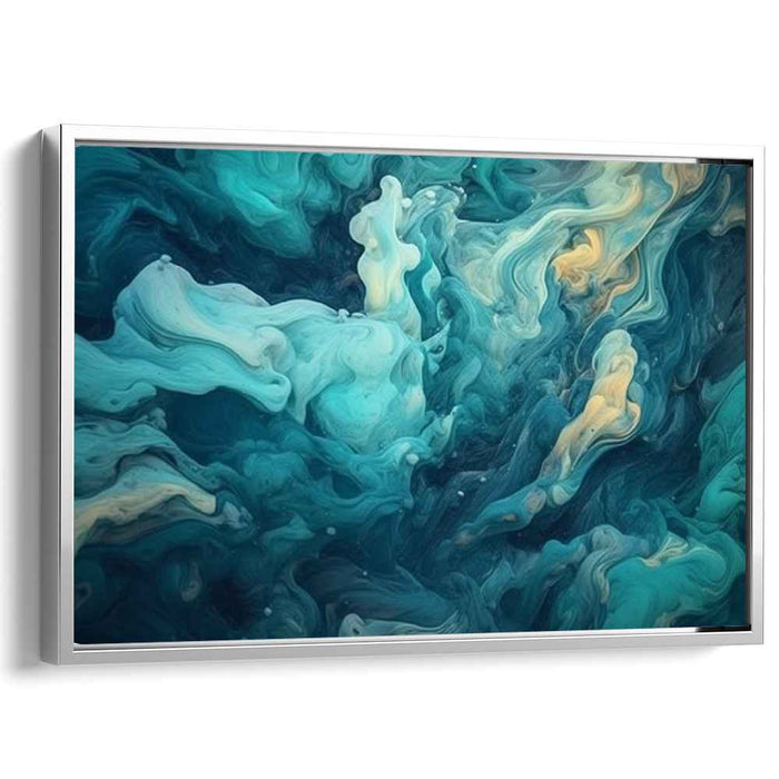 Soft hues of turquoise, aqua, and delicate touches of golden yellow interplay in this artwork, infusing warmth and illuminating the undulating forms that grace the composition. The artist masterfully employs fluid, organic shapes and a marbling technique to evoke a sense of perpetual movement and flow, reminiscent of the abstract expressionist style.