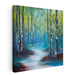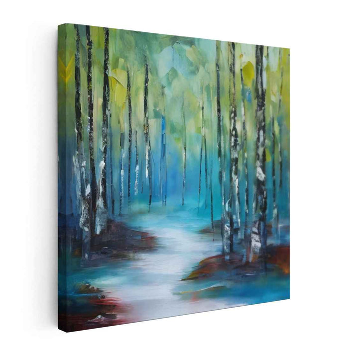 Immerse yourself in the ethereal beauty of 'Aqua Serenity Mirage: A Tranquil Abstract Landscape,' a captivating canvas art that beckons viewers into a dreamlike woodland realm. This mesmerizing artwork skillfully blends abstract interpretations of trees reaching towards a luminous, overcast sky, creating a scene brimming with mystery and serenity.