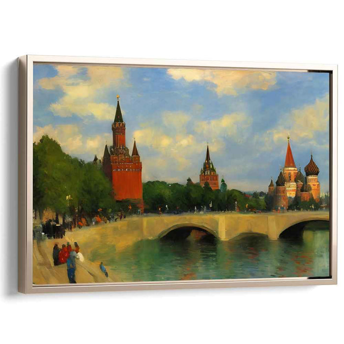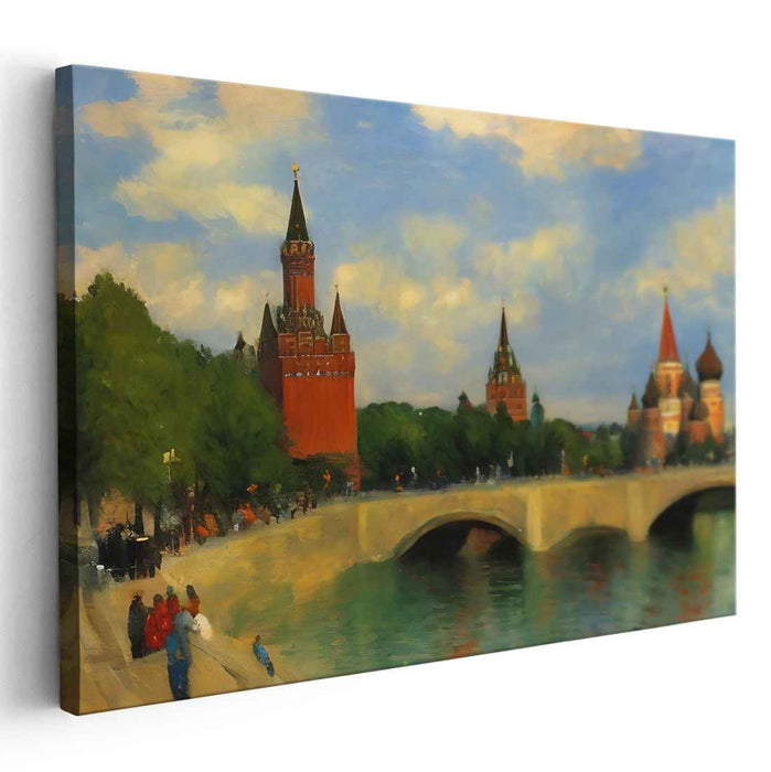 Introducing 'Architectural Echoes Dance,' a mesmerizing canvas art that transports viewers to a historical cityscape, likely depicting the iconic Kremlin towers and Saint Basil's Cathedral in Moscow. This captivating artwork showcases the vibrant red towers of the Kremlin dominating the scene against a partly cloudy sky, exuding a sense of grandeur and historical significance.