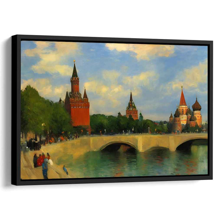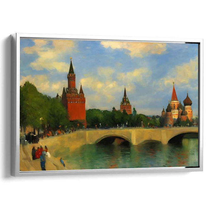 The canvas is filled with the majestic architectural marvels of the Kremlin and Saint Basil's Cathedral, meticulously rendered in a realistic style that captures intricate details, emphasizing their cultural and historical importance. The serene river in the foreground mirrors the bustling cityscape, adding a touch of tranquility to the vibrant scene.