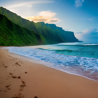 The primary colors of this artwork are the rich greens of the cliffs and the deep blues of the ocean, complemented by the sandy beige of the beach and the soft pastels of the sky. The artist skillfully portrays the gentle waves kissing the shore, their frothy crests adding a dynamic element to the composition. Above, the sky transitions in a soft gradient of blues and whites, with warm golden hues from the setting sun casting a tranquil and calming ambiance over the scene.