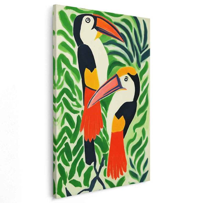 Introducing "Avian Canopy Symphony: Vibrant Jungle Birds Canvas Art Print," a captivating piece that transports viewers into the heart of a lush tropical paradise, where two majestic toucans take center stage amidst a riot of vibrant colors and dynamic forms. This vivid artwork skillfully captures the essence of these exotic birds, showcasing their iconic large beaks and striking plumage against a backdrop teeming with the verdant beauty of the rainforest.