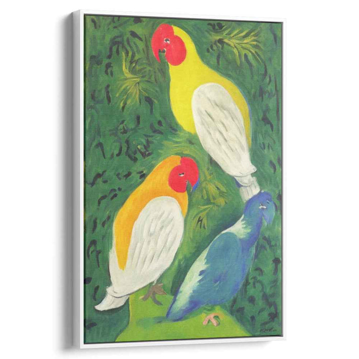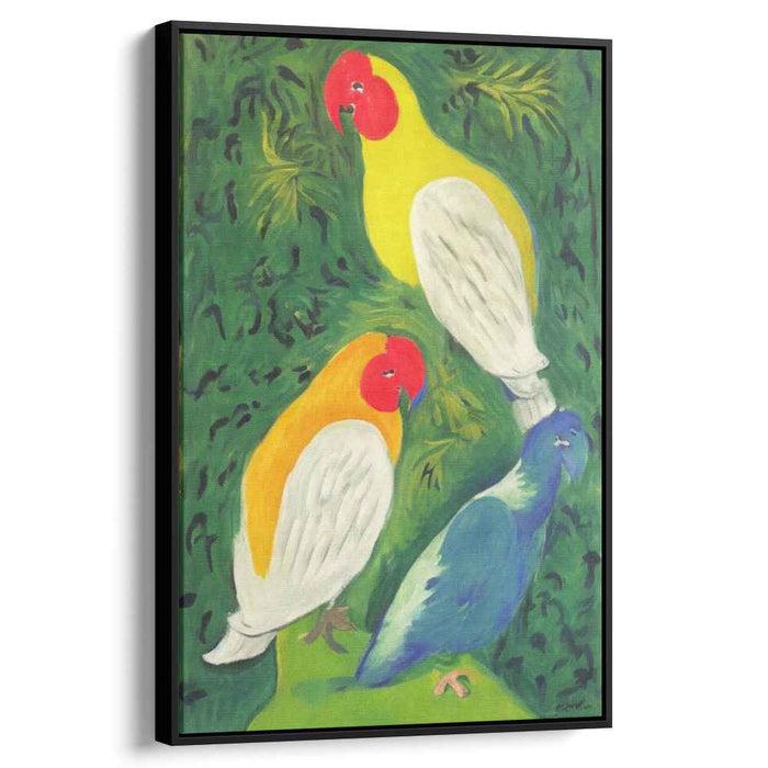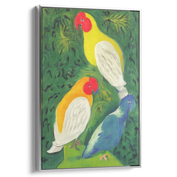 Executed in a loose and somewhat abstract style, the painting employs broad, fluid brushstrokes that imbue the birds with a sense of movement and vitality. The composition, balanced yet dynamic, guides the viewer's eye across the canvas, inviting exploration of every detail of color and form, reminiscent of the works of renowned artists like Franz Marc and Henri Rousseau.