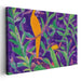 Introducing 'Avian Sunset,' a captivating canvas art print that showcases a bright orange bird elegantly perched amidst lush green foliage, set against a deep purple backdrop. This artwork is a visual delight, with the bird's vibrant plumage standing out against the verdant surroundings and the rich, dark background, creating a striking contrast.