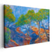 The scene unfolds with vibrant trees arching gracefully over the rugged canyon, their lush canopies swaying in the gentle breeze. The juxtaposition of the soft foliage against the harsh, jagged rocks below creates a captivating visual drama that is further accentuated by the brilliant blue expanse of the sky above. The artist's choice of colors infuses the artwork with depth and vitality, inviting viewers to immerse themselves in this enchanting landscape.