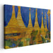 The golden pagodas, with their ornate details, stand out boldly against the rich blue backdrop, creating a visual feast for the eyes. The primary color palette of gold exudes opulence and sacredness, while hints of green and red add layers of depth and dimension, enhancing the overall visual impact of the piece.