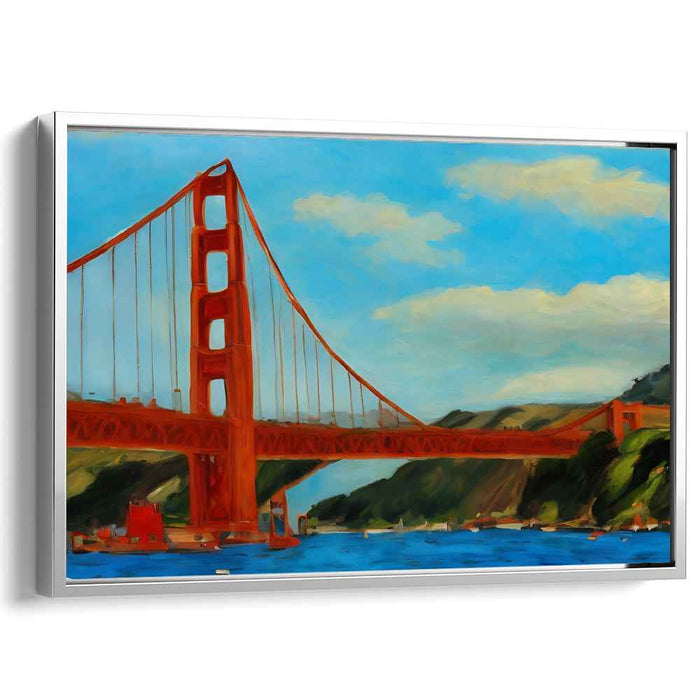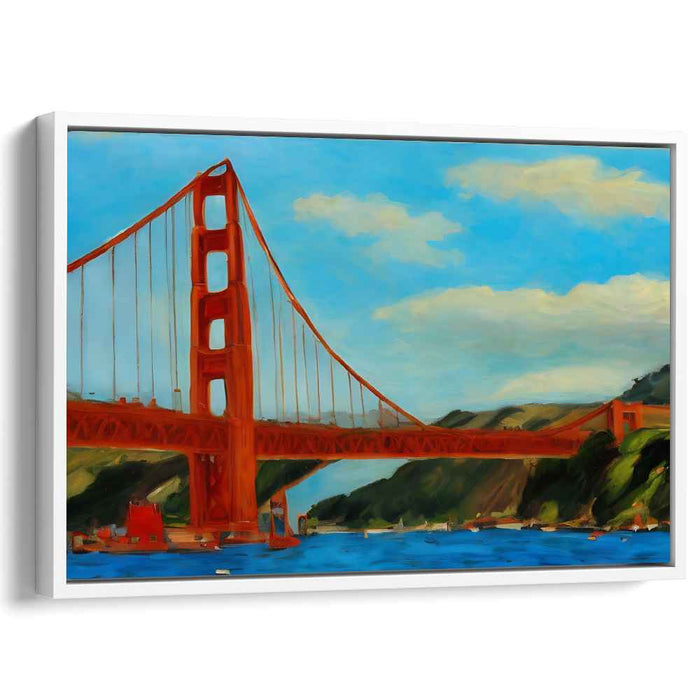 Introducing 'Bay Bridge Vista: Scenic San Francisco Bridge,' a mesmerizing canvas art print that encapsulates the grandeur of the iconic Golden Gate Bridge in San Francisco. This artwork masterfully portrays the bridge's majestic red-orange structure set against a backdrop of a vivid blue sky adorned with delicate, wispy clouds.