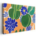 This artwork boasts a bold interplay of primary hues, with vivid oranges and deep blues harmonizing alongside secondary tones of green and yellow. Oversized and stylized flowers take center stage, their simplified yet expressive forms drawing the gaze with contrasting, luminous centers. Complementing the florals, abstract leaves dance across the canvas, infusing the composition with movement and organic richness through varying shades of green and intriguing shapes.