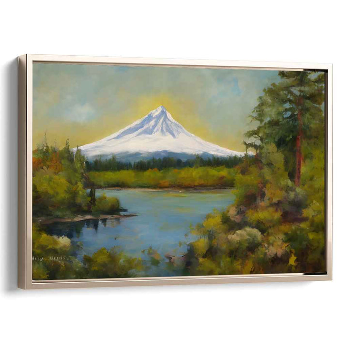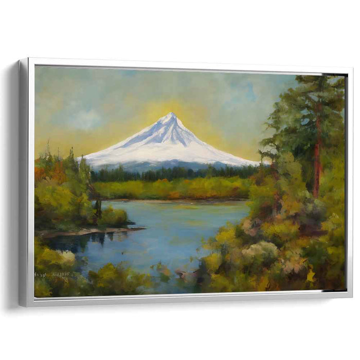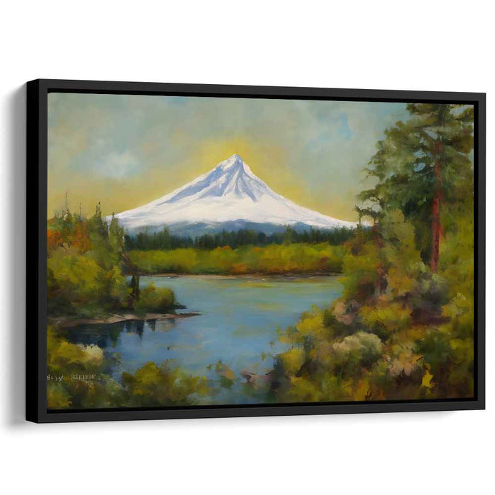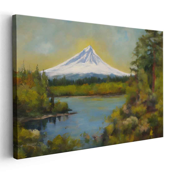 Introducing 'Brushless Meadow Harmony,' a mesmerizing landscape canvas art that transports viewers to a serene world of snow-capped peaks and verdant valleys, reminiscent of the majestic Mount Hood. This captivating painting captures the essence of nature's splendor, showcasing a harmonious blend of lush greenery, a meandering blue river, and the awe-inspiring grandeur of a majestic mountain.