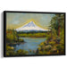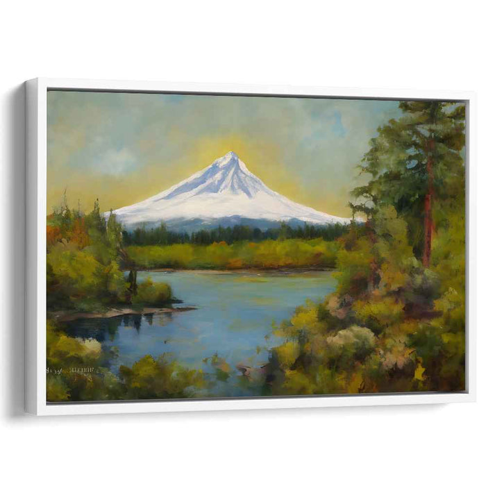 The artwork is a symphony of colors, with rich greens, tranquil blues, and earthy tones dominating the canvas. The dense foliage and reflective waters come to life through the artist's skillful use of color, creating a tranquil and inviting oasis. The mountain, depicted with delicate white strokes, stands tall against a hazy sky, hinting at the quiet beauty of early mornings as mist dissipates with the rising sun.