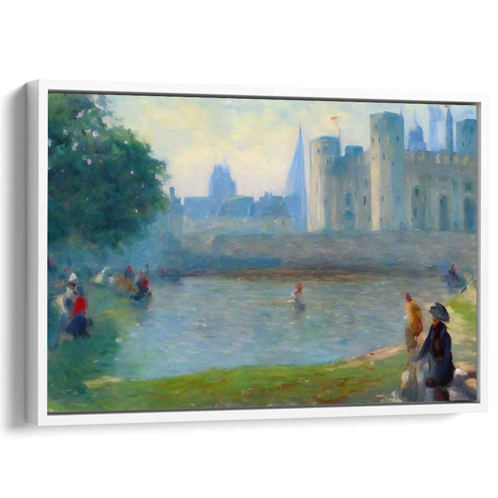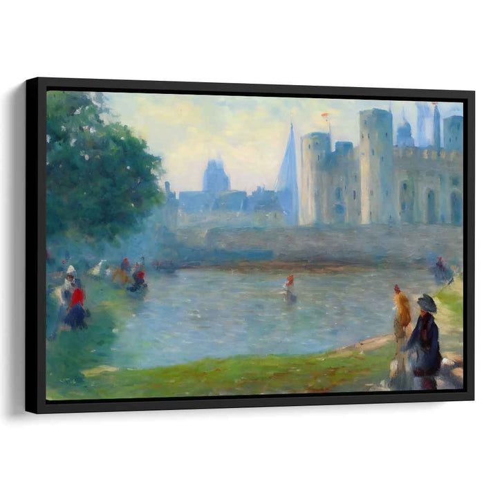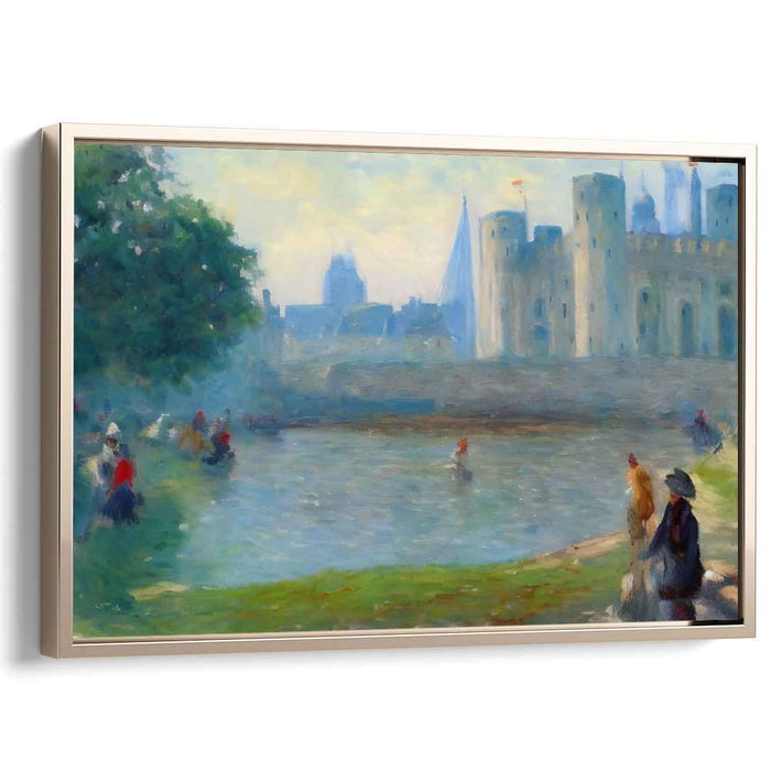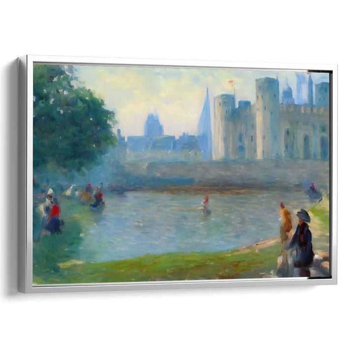 Introducing "Castle's Reflections: Impressionist Castle and River Scene," a mesmerizing canvas art that immerses viewers in a serene, historical landscape featuring an imposing castle and a tranquil river. The artwork exudes timeless grandeur, with the castle's robust stone walls and turrets dominating the right side of the composition.