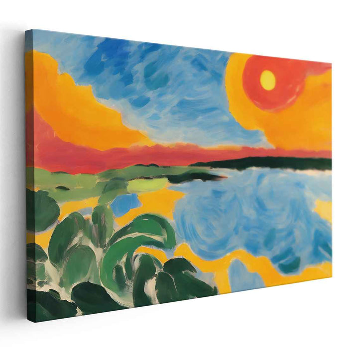 Introducing 'Chromatic Nature Tapestry,' a vibrant landscape canvas art print that transports viewers into a mesmerizing sunset scene, enveloped in the warm embrace of a setting sun. This captivating artwork captures the essence of a tranquil sunset over a serene body of water, where the sky ignites with a fiery display of red and orange hues, casting a radiant glow across the horizon.