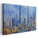 Introducing 'City Silhouette Twilight Mirage: Impressionistic Urban Skyline at Dusk,' a captivating canvas art that immerses viewers in a mesmerizing cityscape dominated by towering skyscrapers reaching towards the sky. The focal point of the composition is on two magnificent towers that command attention amidst a vibrant urban setting.