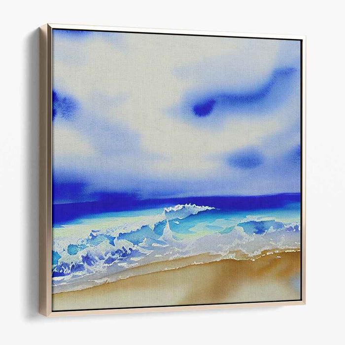 Immerse yourself in the serene beauty of 'Coastal Watercolor Bliss: Coastal Watercolor Bliss,' a captivating canvas art print that brings the essence of a tranquil beach to your living space. This artwork features a stunning depiction of a vibrant beach scene, where the sky meets the sea in a dance of blues and whites. The horizon is painted with a deep, vivid blue that gradually lightens as it touches the fluffy, soft clouds above, creating a contrast that is both striking and soothing. The sea is rendered in shades of turquoise and azure, with frothy waves gently rolling onto the sandy shore, depicted in warm beige tones. The watercolor technique used here adds a dreamy, fluid quality to the scene, with colors bleeding into each other, evoking the continuous and calming motion of the waves.