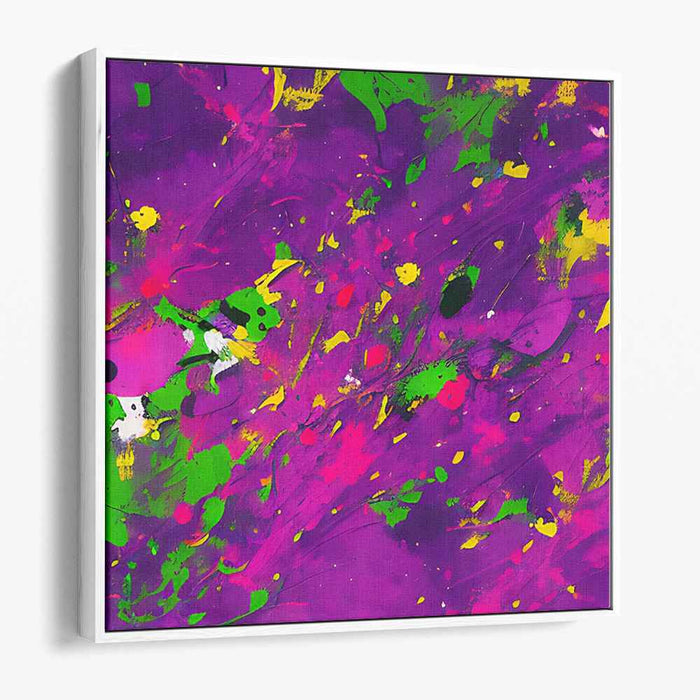 Introducing 'Color Dances Freely,' a mesmerizing abstract expressionist canvas art print that pulsates with energy and color, creating a visual symphony that captivates the eye. The dominant hue of electric purple commands attention, serving as a vibrant backdrop for the lively dance of neon green, fiery pink, and bright yellow splashes that traverse the canvas with exuberance.